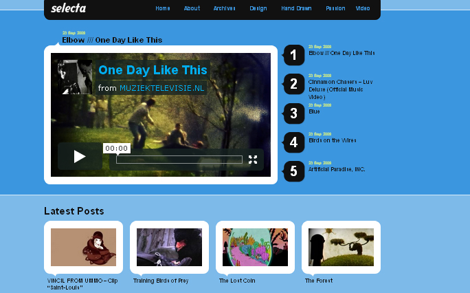 Selecta’s rounded edges and bold, modern color palettes make for a fresh theme that’s best suited to blogs where video will be the main focus. The wider-than-usual frames around thumbnails and videos bring to mind the retro-cool of Polaroid photographs and old home movies.